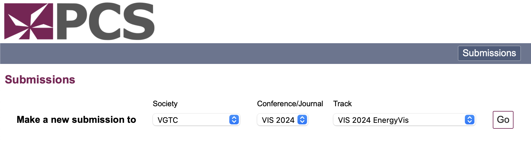 Papers should be submitted through PCS via VGTC > VIS 2024 > EnergyVis . After logging into PCS, go to ‘Submissions’, and select Society ‘VGTC’, Conference ‘VIS 2024’, and Track ‘VIS 2024 EnergyVis’.